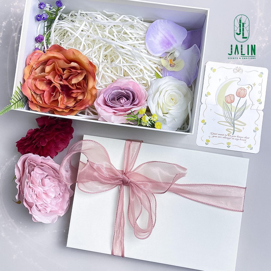 • Hộp + rơm + decor hoa lụa – tăng tính thẩm mỹ, phù hợp quà tặng dịp đặc biệt