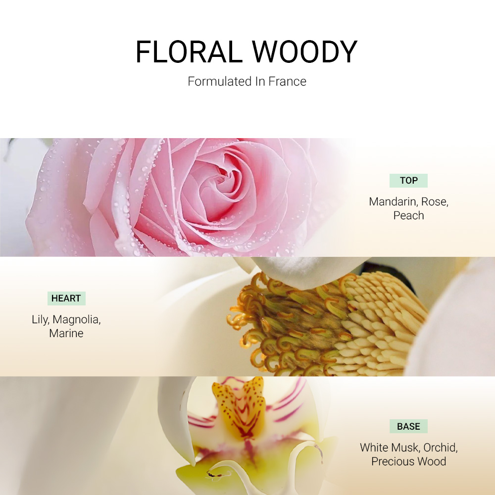 Floral Woody mở ra như khoảnh khắc bạn khẽ tách nhẹ một quả quýt tươi – mùi vỏ quýt bật lên trong trẻo, hơi cay nhẹ. Rồi chỉ vài phút sau, hương hoa bắt đầu hé nở, mềm mại và nữ tính như một làn gió lướt qua khu vườn buổi sớm. Khi tất cả dần lắng lại, chỉ còn lại lớp hương gỗ và xạ hương ấm dịu níu trên da, mang theo cảm giác bình yên, thanh sạch và rất khó quên – một mùi hương chuyển mình nhẹ nhàng nhưng để lại dư vị sâu sắc.