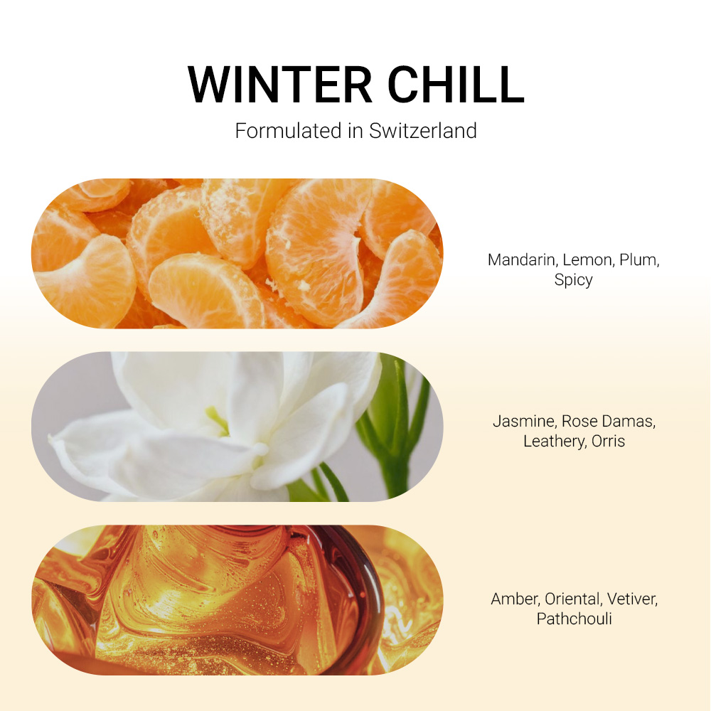 + Tinh dầu nước hoa 3 tầng hương Winter Chill sáng tạo từ Thụy Sỹ, đạt chuẩn IFRA.