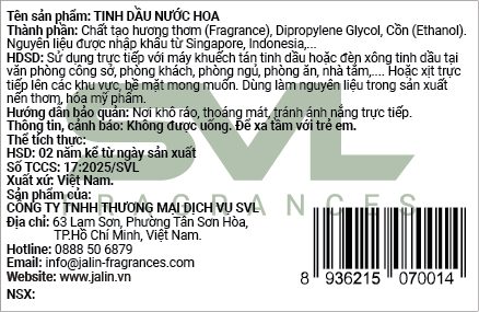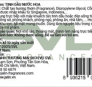 Nguyên liệu được nhập khẩu từ Singapore, Indonesia,... HDSD: Sử dụng trực tiếp với máy khuếch tán tinh dầu hoặc đèn xông tinh dầu tại văn phòng công sở, phòng khách, phòng ngủ, phòng ăn, nhà tắm,.... Hoặc xịt trực tiếp lên các khu vực, bề mặt mong muốn. Dùng làm nguyên liệu trong sản xuất nến thơm, hóa mỹ phẩm.